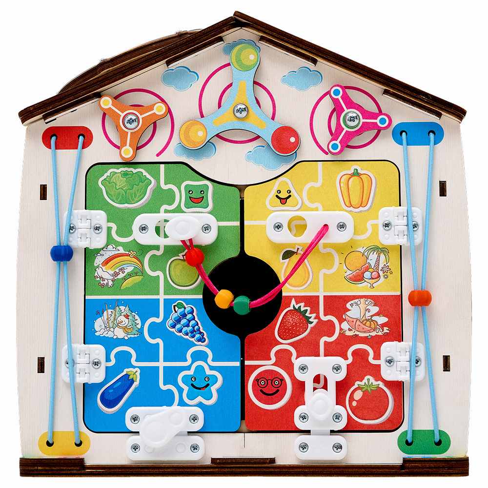 В верхней части игрового поля расположены три спиннера, большой и два маленьких. Слева и справа есть две разноцветные бусины, которые перемещаются по резинкам вверх и вниз. А в центральной части находятся две дверцы, окрашенные в четыре цвета и украшенные тематическими рисунками овощей, фруктов, смайлов и погодных явлений, которые соответствуют временам года. Дверцы закрываются на три замочка – форточный, щеколду и крючок. Открыв все, ребенок получает доступ ко внутреннему пространству домика, где может поселить кукол или припарковать машинки. Если включен блок подсветки, свет загорается и внутри домика.